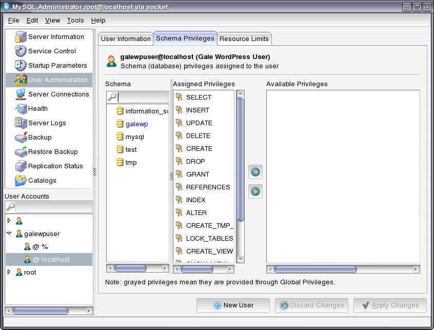 Then set the privs for that connection. Select localhost and go to the privileges tab.