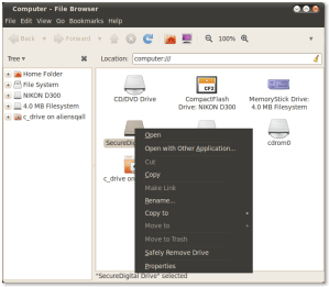 I’m using a Nikon Coolpix S550 that has an SD card slot and Windows mounts it with no problem. I assume the card is Fat-32. It’s an 8GB card. Could that be the problem? Something along the way doesn’t deal with the size of the card? This KB article says that Fat-32 can support devices as large as 32GB.