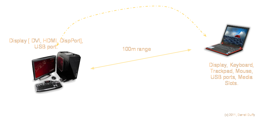 A solution for the power / heat / performance problem for a Gaming Laptop is to move the display and user interface away from the desktop to a laptop form factor, but leave the power, heat and weight behind with the desktop or console.
