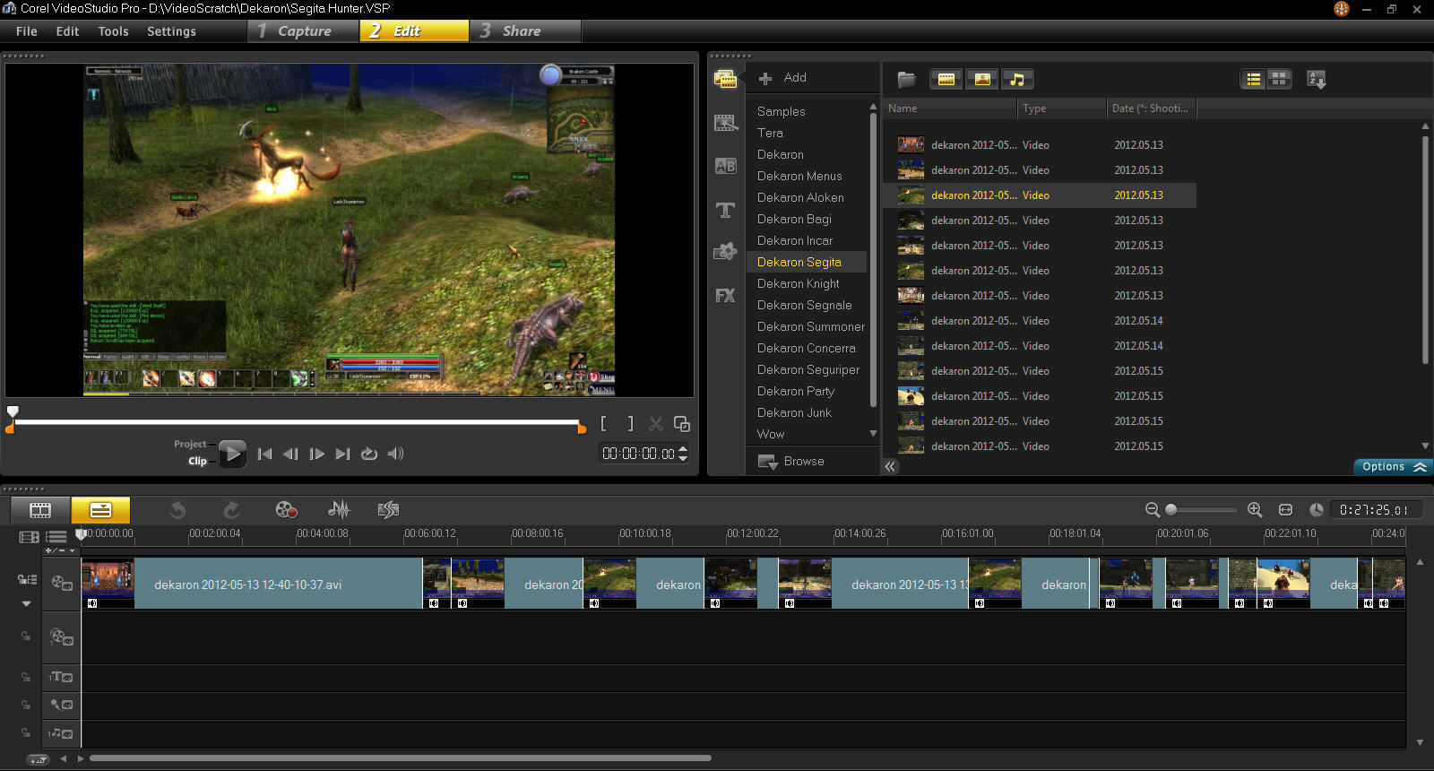 If you are like me, you want to collect your material together by subject, in this case by the class of the game character. Even though the footage was shot at different times, I wanted to collect it together by character class, so after organizing the clips that way, I created projects for each class. To make each project I reviewed the clips by clicking on them in the right panel. Click on a folder to see those clips and then as you click on each clip you see it in the left panel. Click the next picture to see it in more detail.