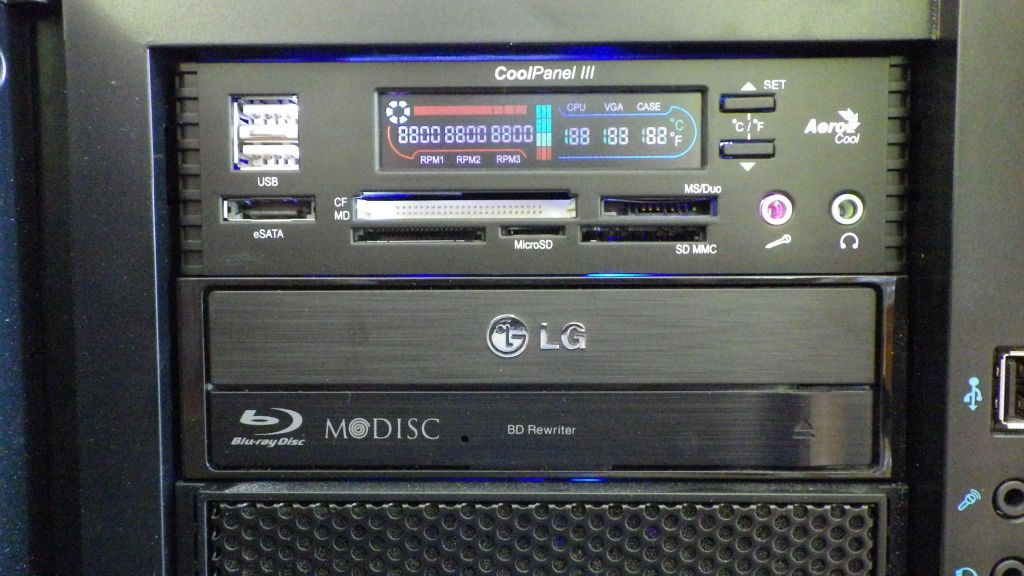 The coolpanel 3 has a media card reader, 3 channel fan controller/ temperature display, audio ports, USB ports and ESATA port. At this point I’m using the USB media card reader and temperature display. The rest of the functions don’t make sense in my current system. There are no more USB connectors on the MB and there are USB ports on the top and front of the case. The temp display is way cool tho and I really needed that media card reader.