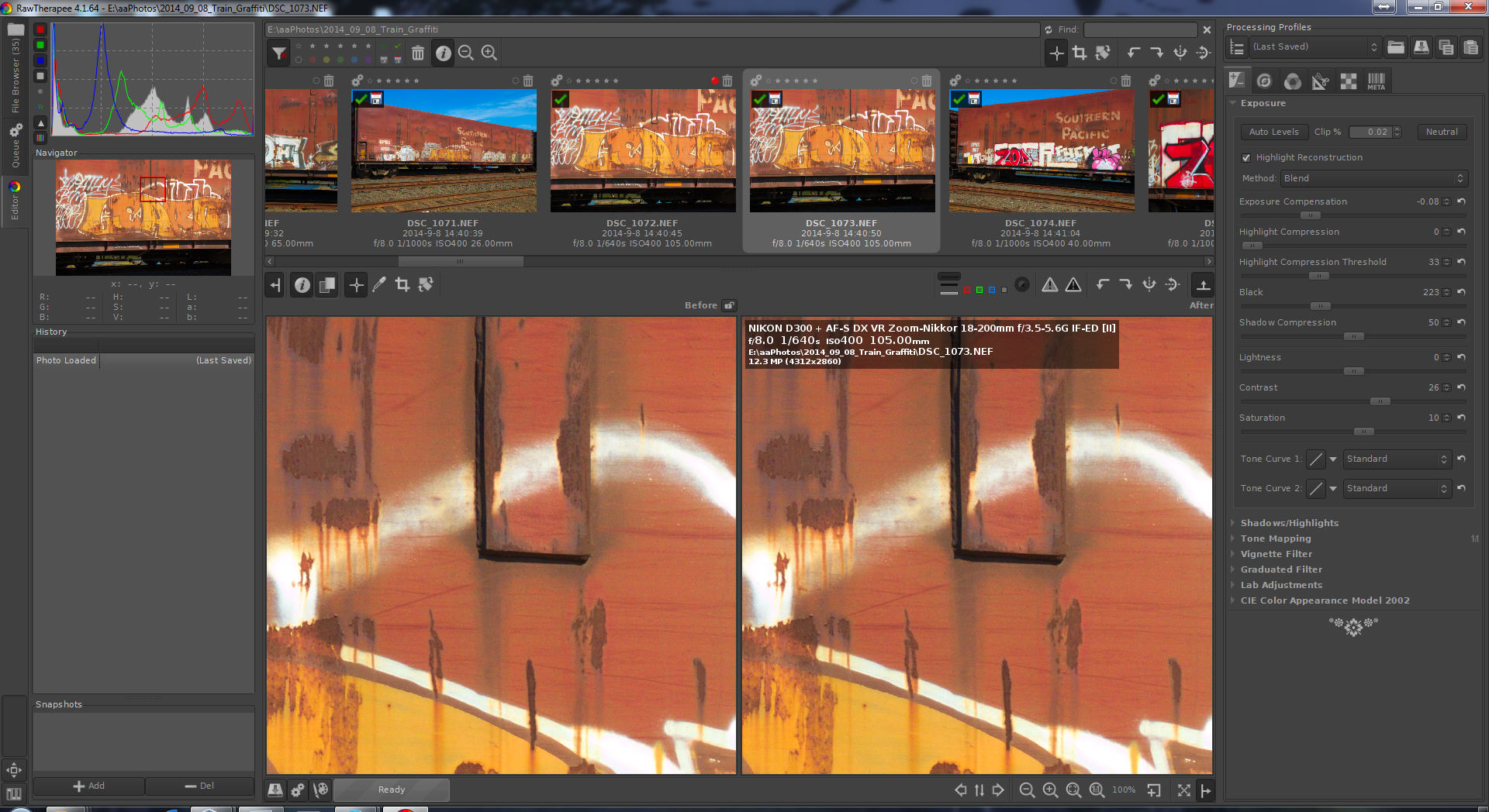 Notice the two similar images in the Film Strip above. This is the display that I’d like, but with different images in the right and left panel. Currently, you can compare only different processing steps of the same image. That’s needed, but doesn’t solve the problem of choosing images to process in the first place.