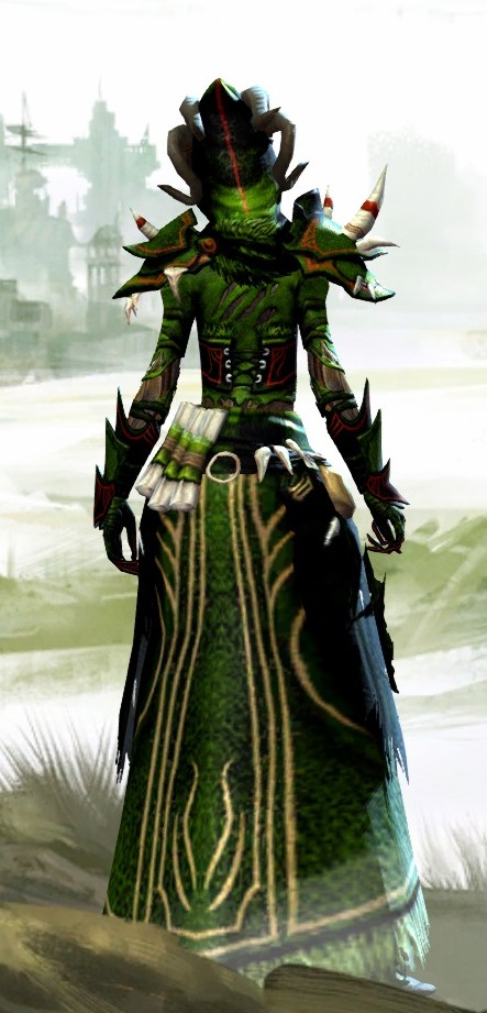 This Sylvari Necromancer is wearing the Light Dry Bones armor which is perfect for Halloween. The wiki tells how to find the Dry Bones armor from Heart Karma merchants so you can get ready for Halloween from about level 30. The dyes are Toxic with Scarlet and Antique Gold trim. She is wearing the full set including the scary helm. |