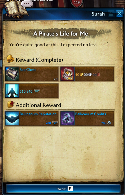Another way to get great fashions, if you like black, is Battlegrounds. I’ve been doing the Corsair Stronghold over and over to get costumes. To get a costume, you need 7000 points, which you can get in about 3 long days of work in the Corsair Stronghold. Starting at level 30 you can queue for the battlegrounds. I’ve tried the Kumasylam, and you may like that one. The Corsair Stronghold is sort of Storm the Castle kind of event where each team of 20 toons alternatively tries to storm and defend the castle. Each run takes 10-25 minutes and gives you from 150-500 points depending on Lose or Win. And once a day you can do the Pirate Daily quest, which gives good loot and 200 points.