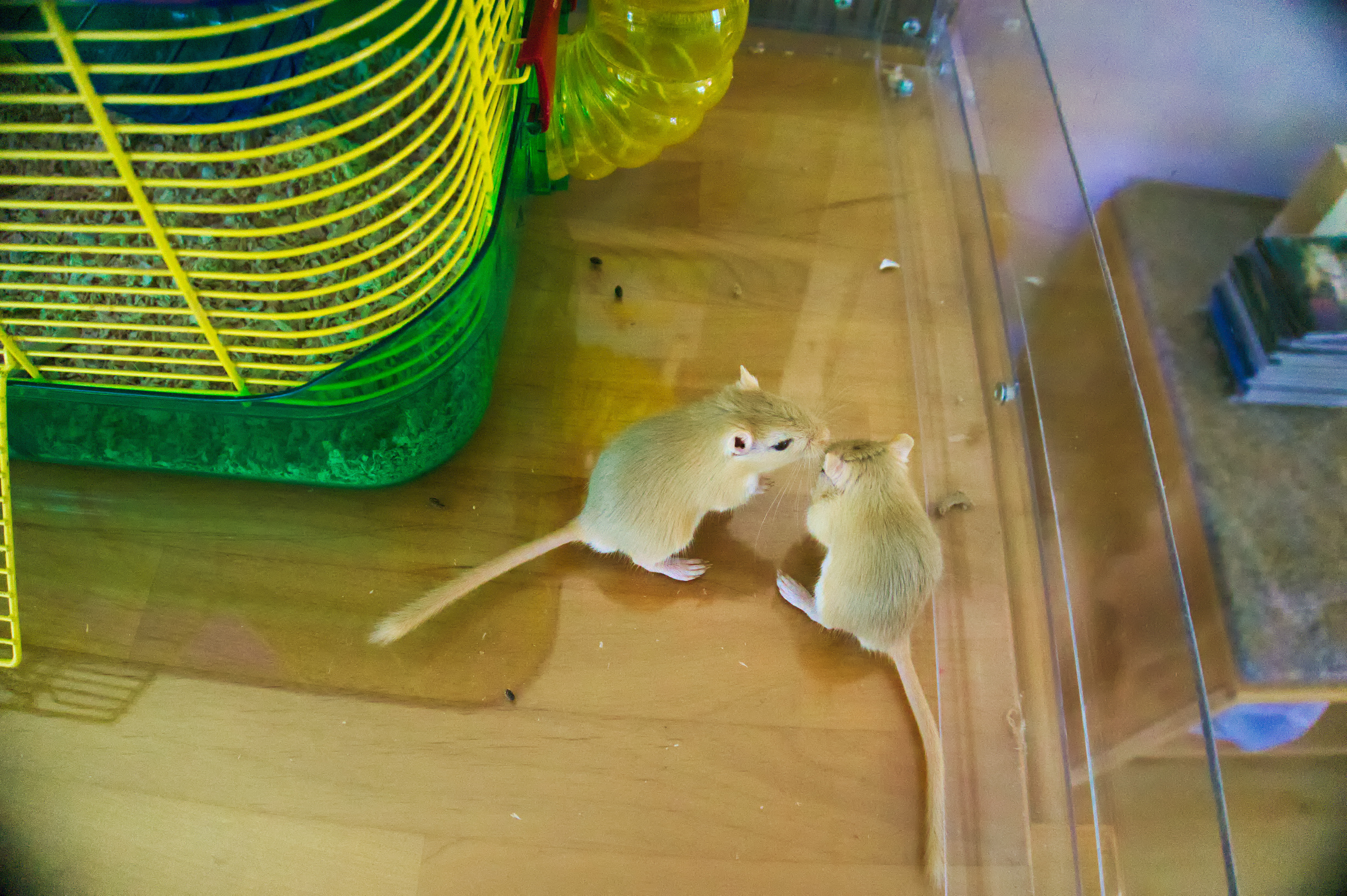 Looks like they get along very well. And they both know how to ride the wheel in the cage, even tho their previous cage did not have a wheel.