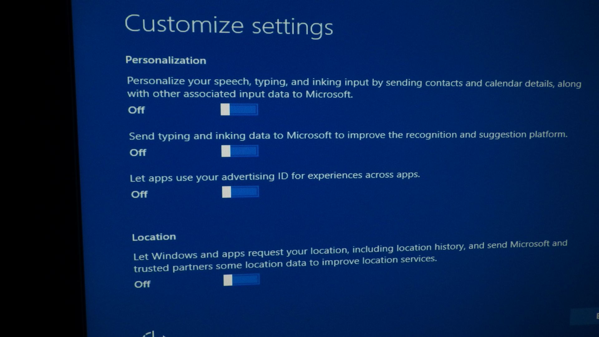 I suggest you not take the default, or express settings, but go through the customization. You will probably want to turn these off, as I did. Who wants to share more than they need to with Microsoft?