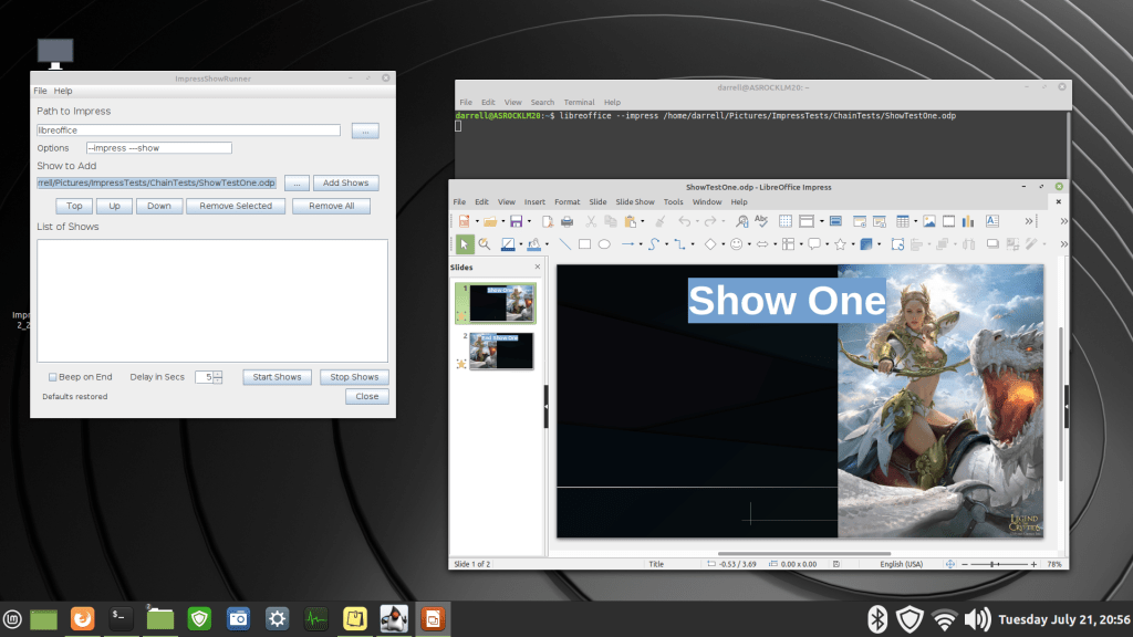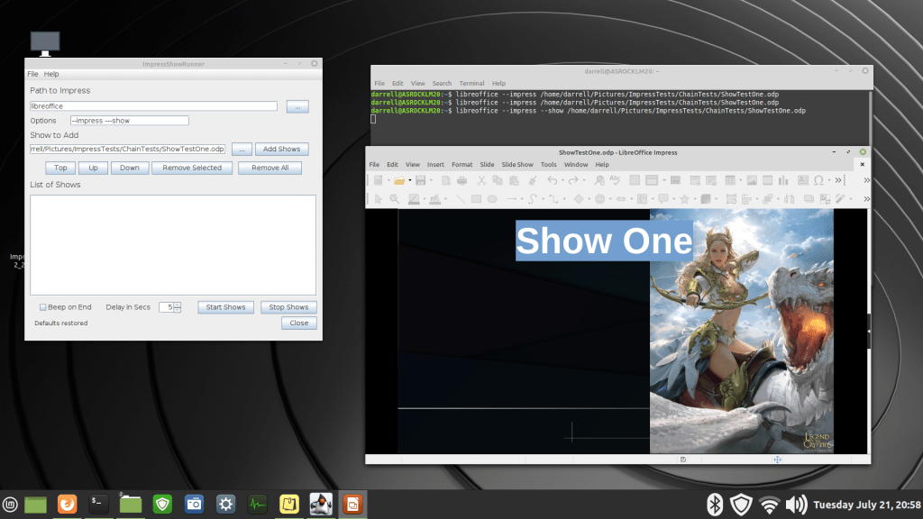 After upgrading my various systems to Linux Mint 20 over the past week or so, I tested this among other programs and all was well. However, the Impress Show Runner fails on one of the systems. It fails in a strange way. All of the features work, but it fails to launch the Impress program. If you type the impress program line that the program uses into a terminal, it works fine. So libreoffice impress is there and works fine. Here is the system where it fails: