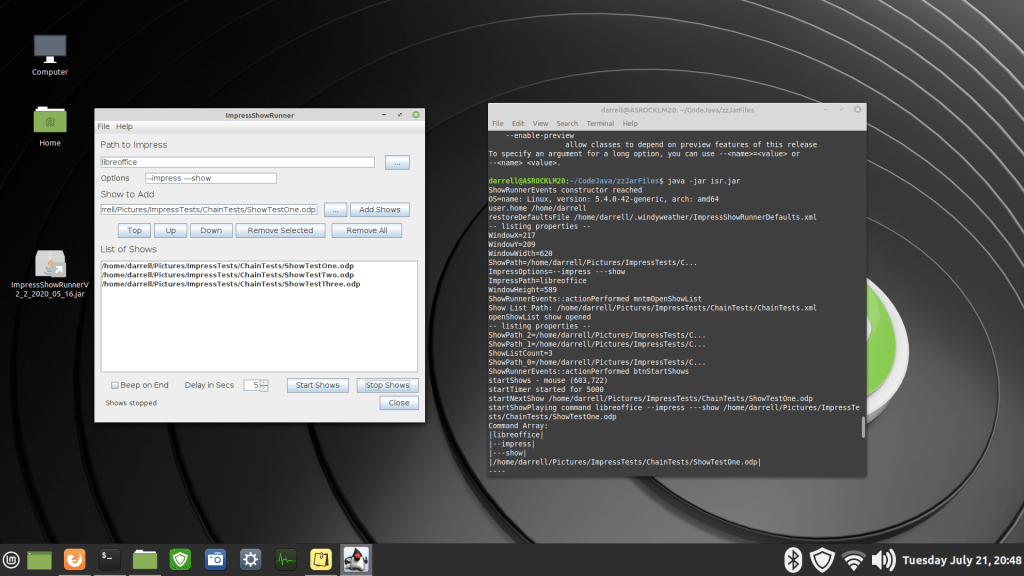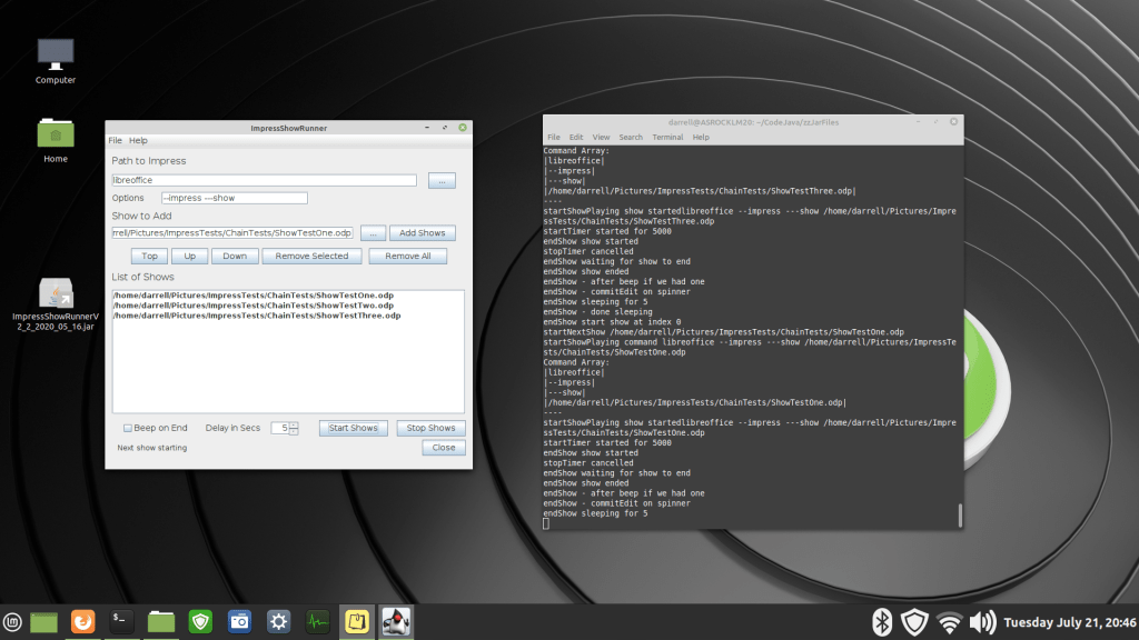 Back in April 2020, I wrote a little program to run a sequence of LibreOffice Impress Slide shows. For ease of deployment on Windows and Linux, I built the program in Java. And it worked just fine. Here’s what the program looks like: