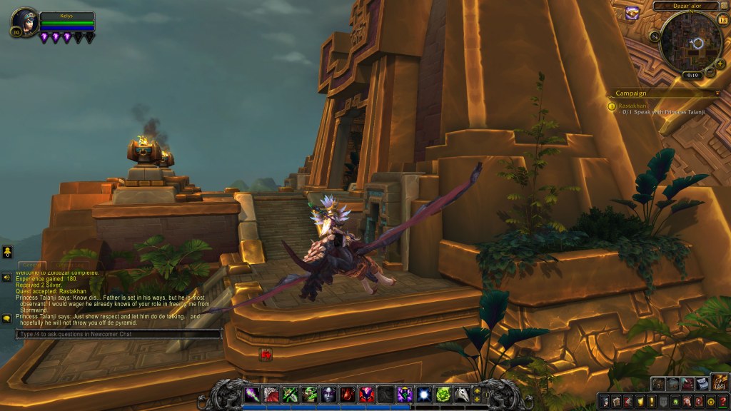 And the money piles up too. At the end of Exile’s Reach I had 7 gold and the mount training only cost 10 silver. I already had a mount, but they gave you a racial mount anyway, so that’s free. Not sure if they changed the “Starter” gold cap. We’ll see. Used to be 10 gold.