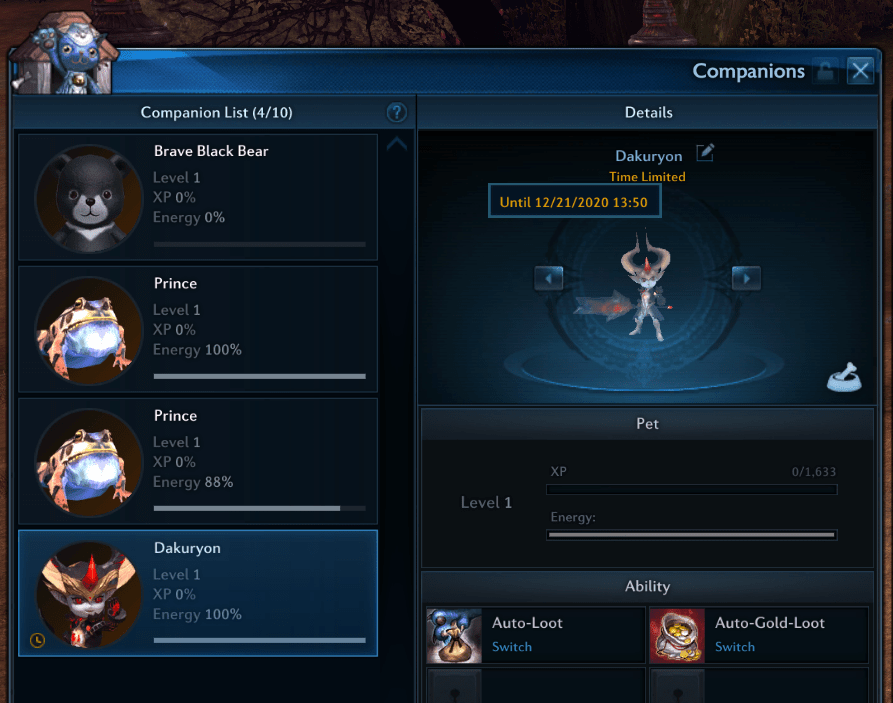 But notice all the other items with little timer icons on them. The frogs are permanent. Maybe the Bear too, which is new. But the Dakuryon pet is on a timer.
