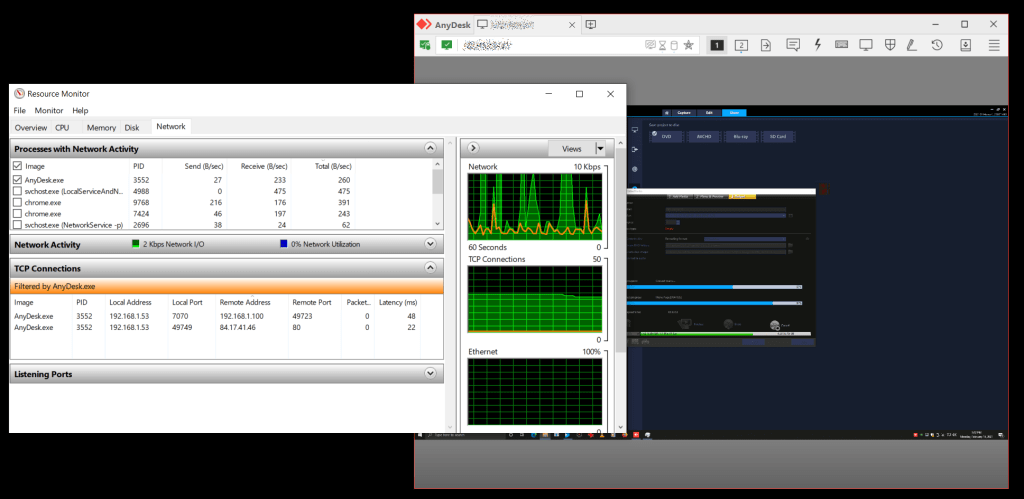 Notice that the AnyDesk connections are with the local machine 192.168.1.100. There is a remote connection using Port 80 with a server, but once the connection is made to the remote machine, the desktop image and keyboard /mouse traffic is completely local. Faster and more secure.
