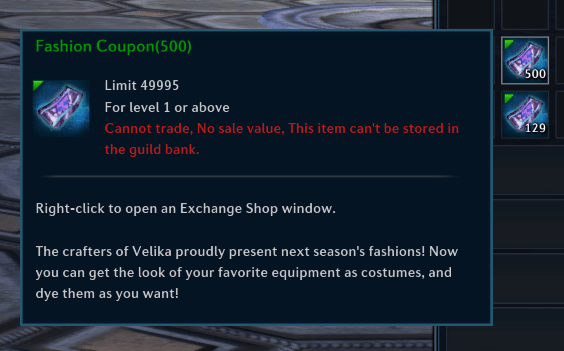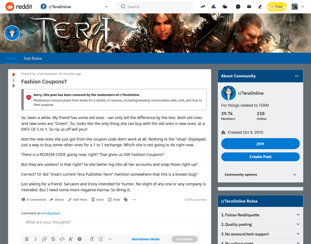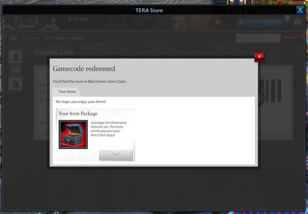 I got an email from Tera / Gameforge about a new redeem code with some goodies. I don’t play much any more, but what the heck. The items included Fashion Coupons for costumes. Cool. Way back in the day, you could farm BAMs [Big Ass Monsters] all day long and accumulate FCs for sweet outfits and weapon skins. But that shortly changed and the sources of FCs were put behind paywalls. Here’s the email offer: Don’t worry. The code is not a secret. Same for everyone if you wanna use it.