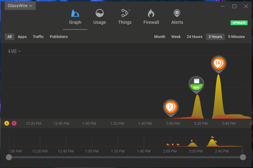 Glasswire even automatically switched to a “Dark Theme” on my backup computer where I use a dark theme in windows. Very cool. Notice that the graph has 5 min, 3 hours, 24 hours, week and month options for the length of the graph as well as sliders on the bottom to adjust the time frame of the graph. The graph is stored in a database.