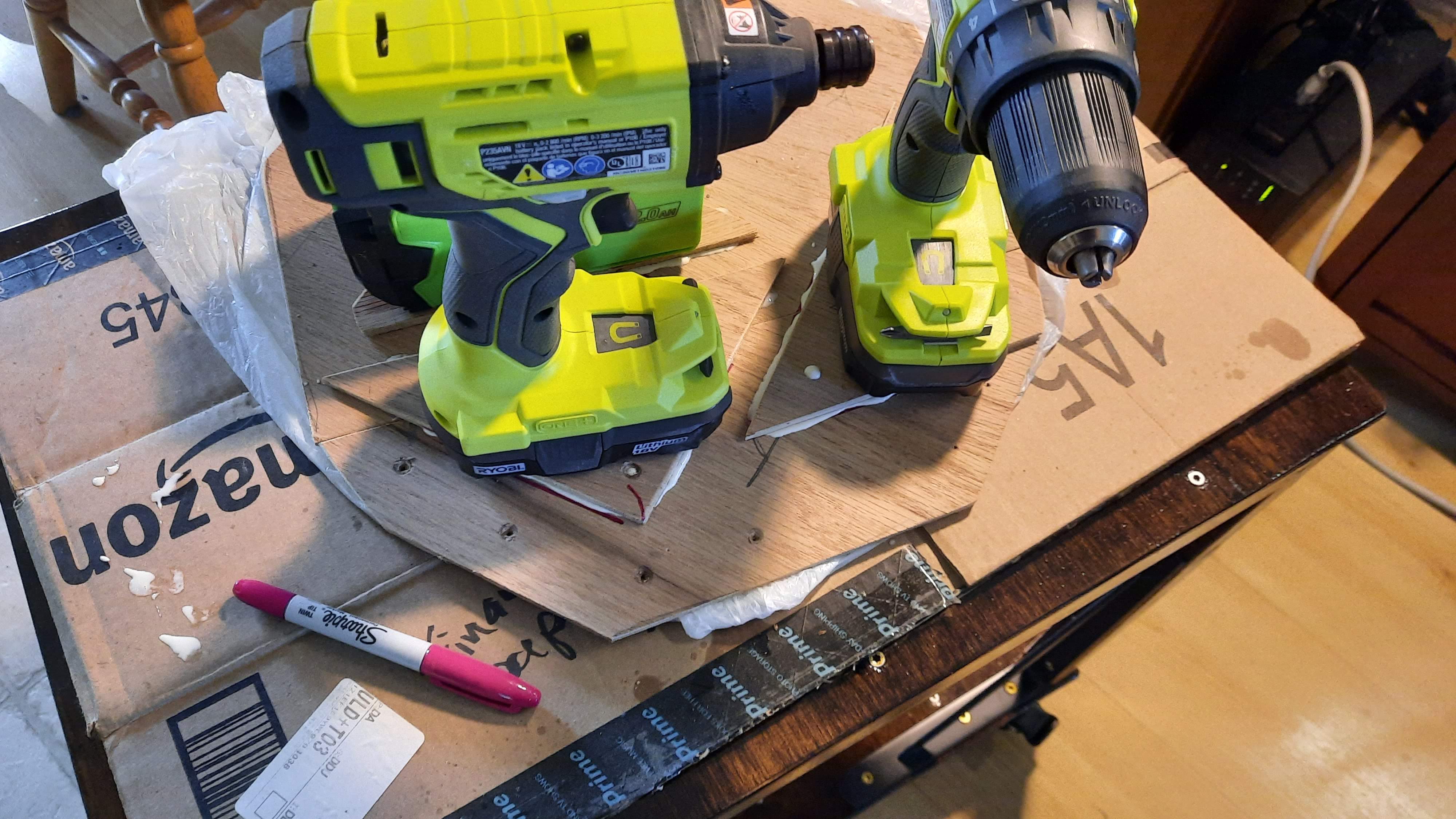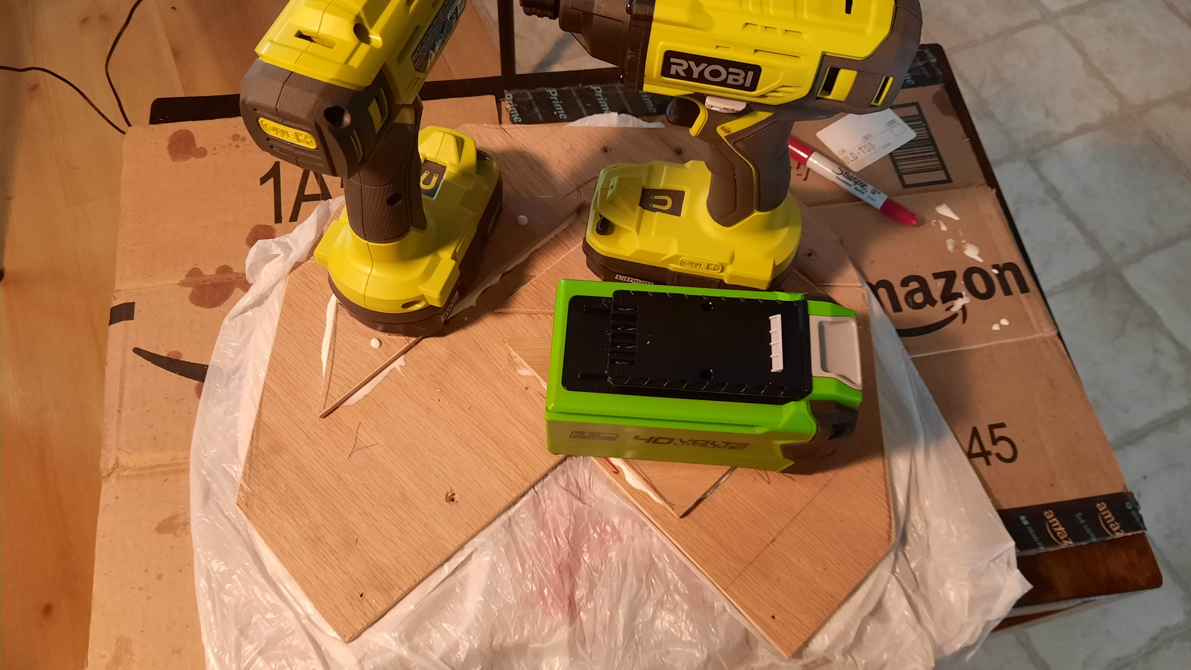I didn’t have a scrap large enough, so I glued some 1/4″ plywood scraps together to make a plate to hold the lights.