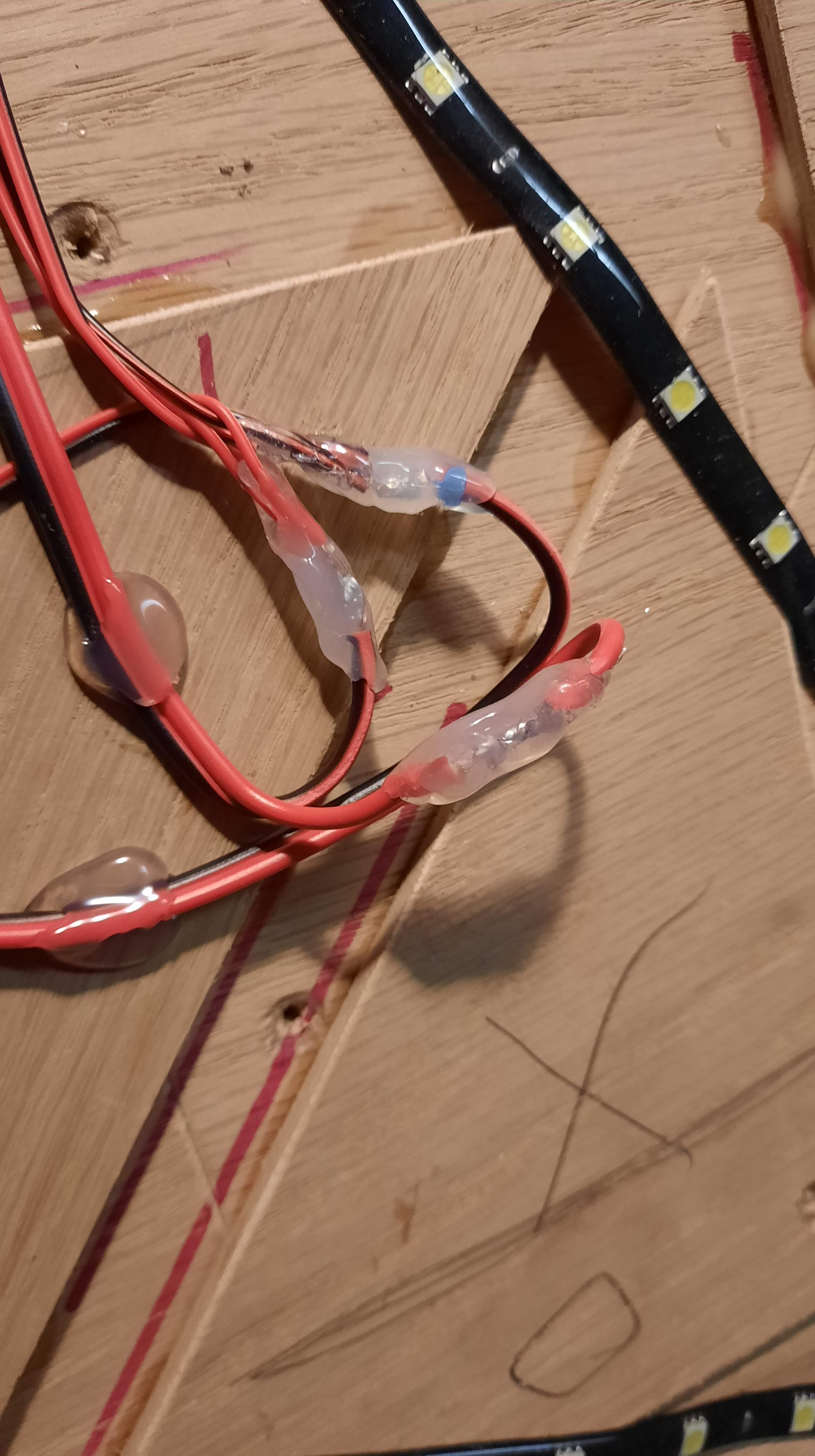Looks like Lithium batteries make good clamps too. And then hot glue to insulate and hold the wires onto the plate. The LED strips have adhesive backing.
