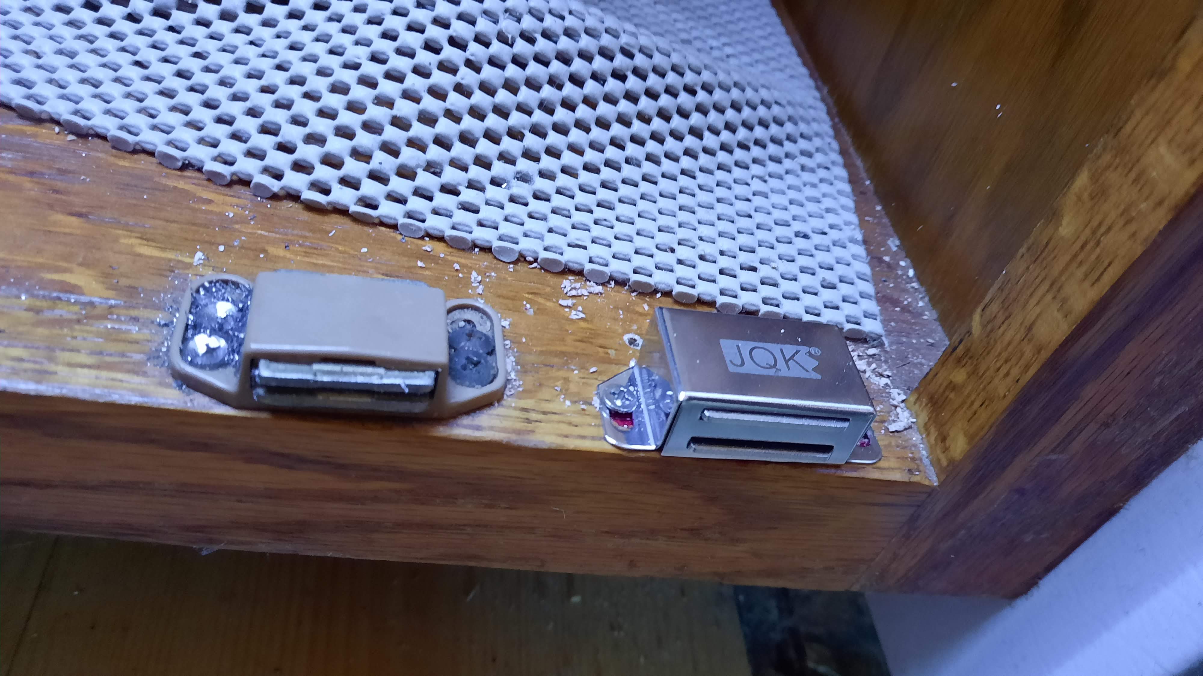 The plate is just screwed up under the cabinet. The switch is screwed to the cabinet opening at the top. The magnetic closure at the bottom. And it works pretty well. I wasn’t able to remove the screws holding the old closure, which was too weak to close the switch. I’ll have to use an oscillating saw when I get around to removing the old magnet.