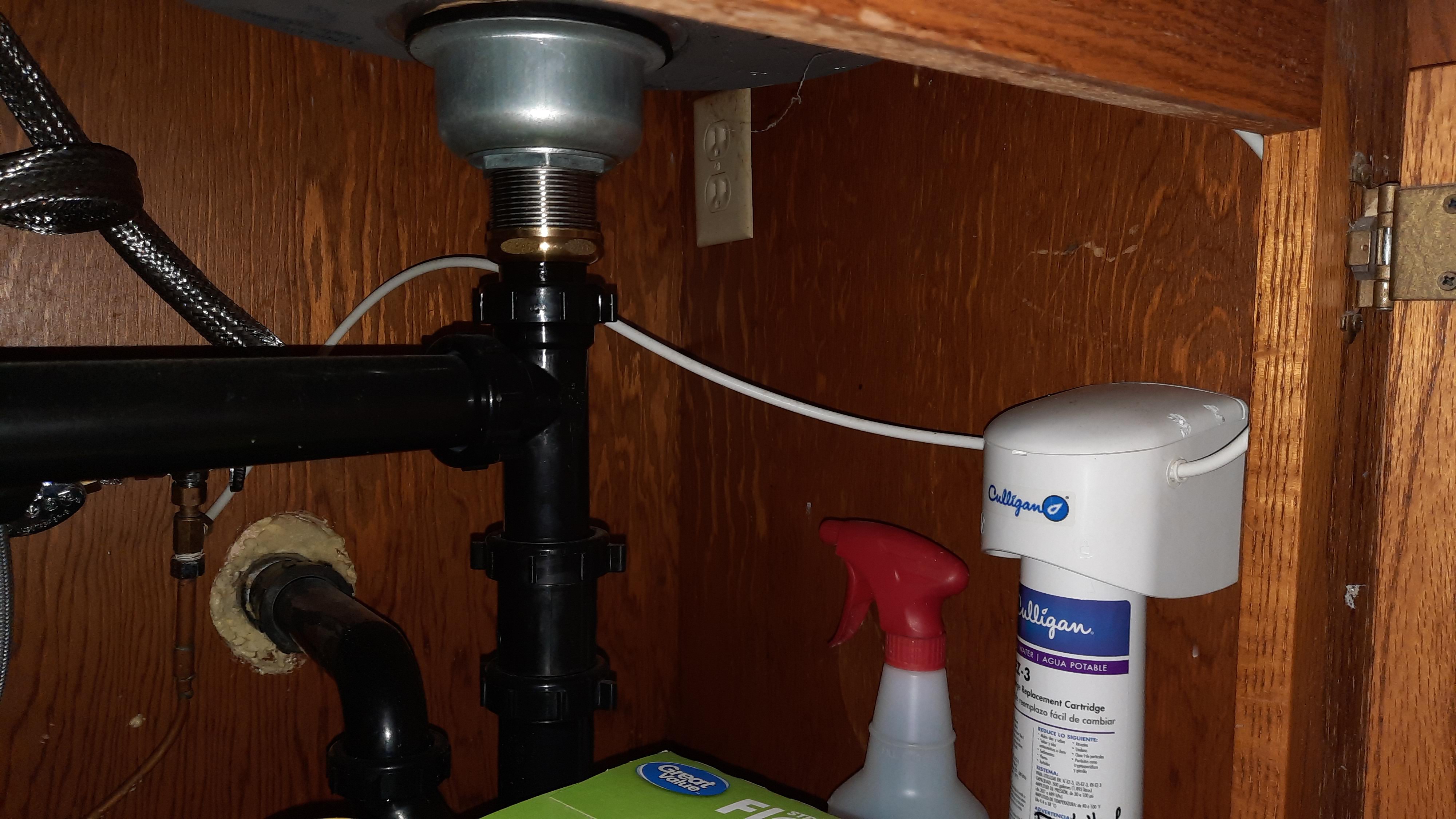 The power supply is in the sink cabinet to the left. It plugs into the outlet for the Disposer which I no longer have.