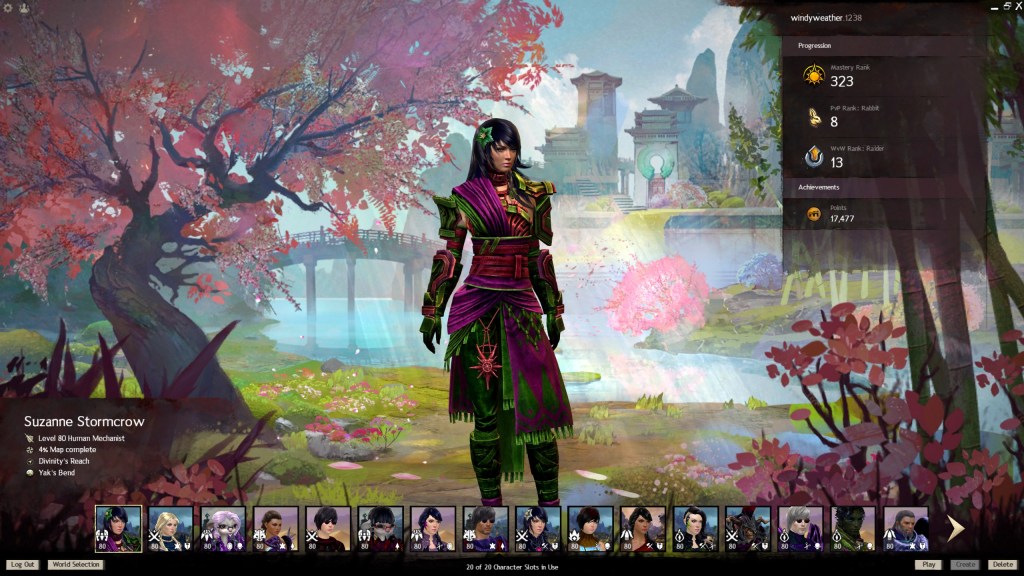 I’ve just created a new character in Guild Wars 2. And while I have lots of XP Tomes to instantly – almost anyway – level her up to the cap of 80, and while I have crafting skills on my account to dress / outfit her with armor, weapon, jewelry etc. and while I have to start over visiting and opening up the world, that’s more fun than doing the same thing over and over. I’ve done the Guild Wars 2 maps / towns and story for a couple of dozen times before on my other characters, but it’s way more fun than spamming the same dungeon over and over. And sitting around for 10 minutes for the dungeon queue to pop.