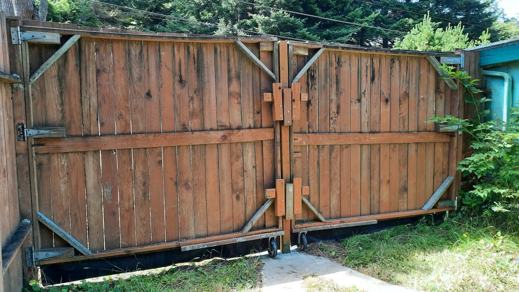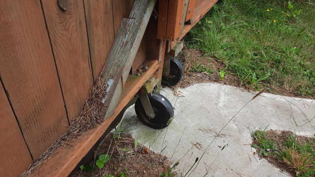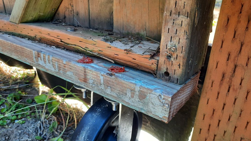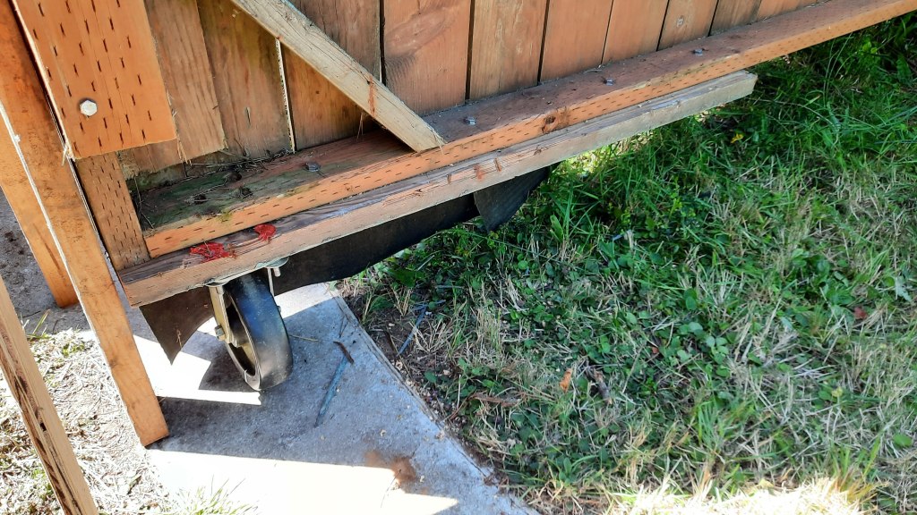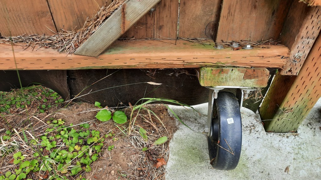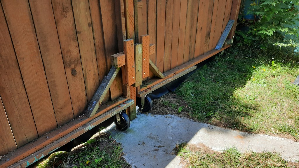The left side caster is tilted and looks like it will break off soon. As you can see the casters are held on with short pieces of 2 by 6 which are then screwed with lag screws into the bottom 2 by 4 of the gate. On the left side the 2 by 4 is twisting under the load of the caster.
