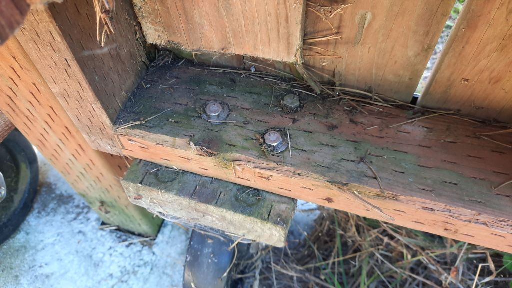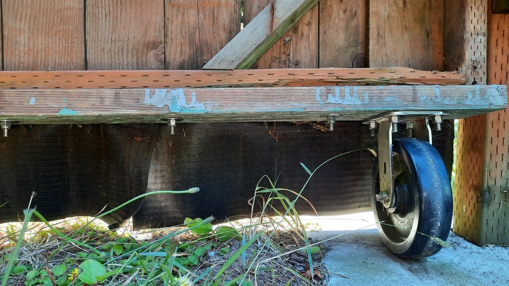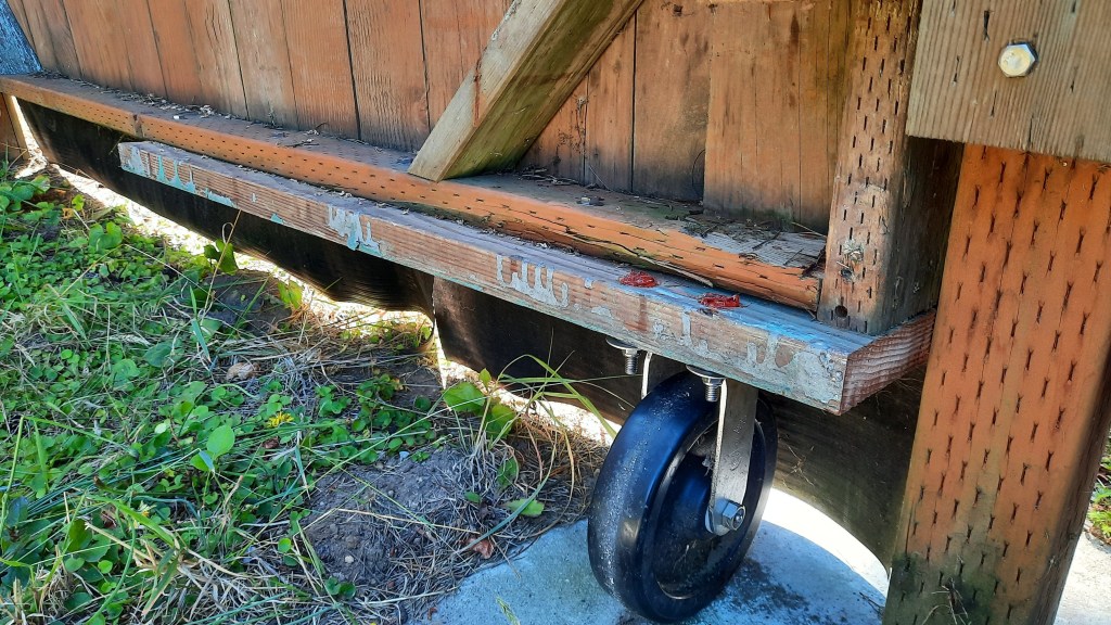 The hardware is all stainless since I live on the coast of Oregon. Also the 3/8″ bolt heads holding the casters on are recessed and covered with silicon to slow down the rot of the 2 x 6 since the recess goes through the treatment.