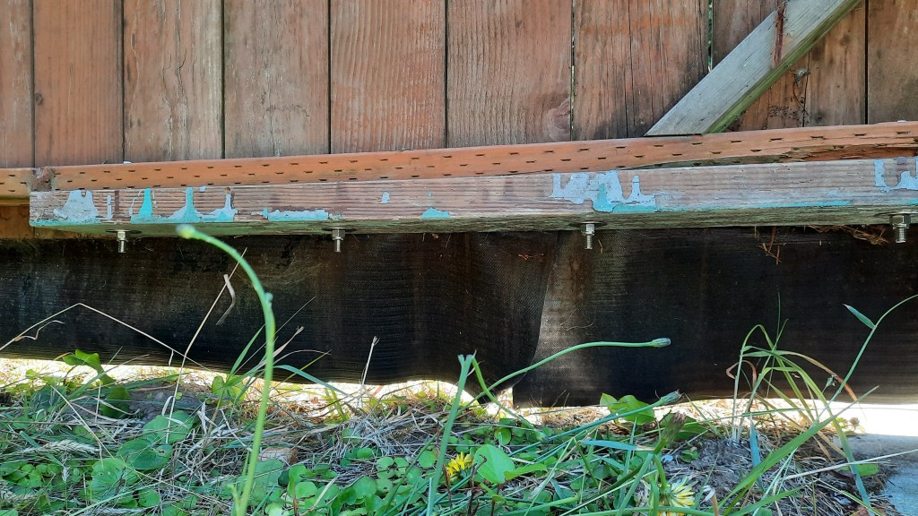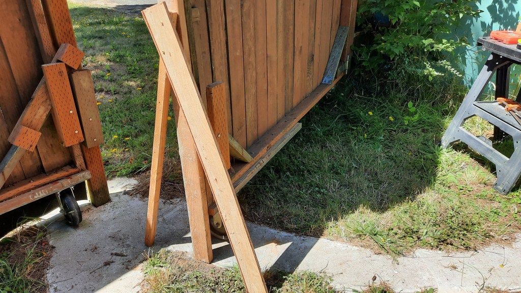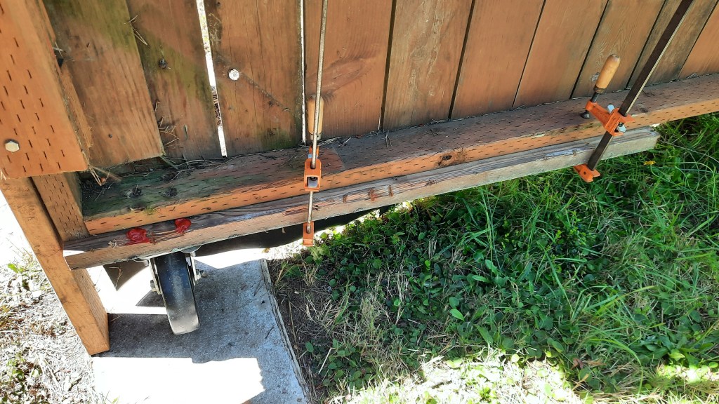 The fix I’ll try is to use a long 2×6 rather than a short piece and extend the 2×6 under the the vertical piece at the center to prevent twisting. I’ll bolt the long 2×6 to the 2×4 so their held tightly together to stiffen them. I had some used treated 2 by 6 left over from tearing off a partially rotted deck.