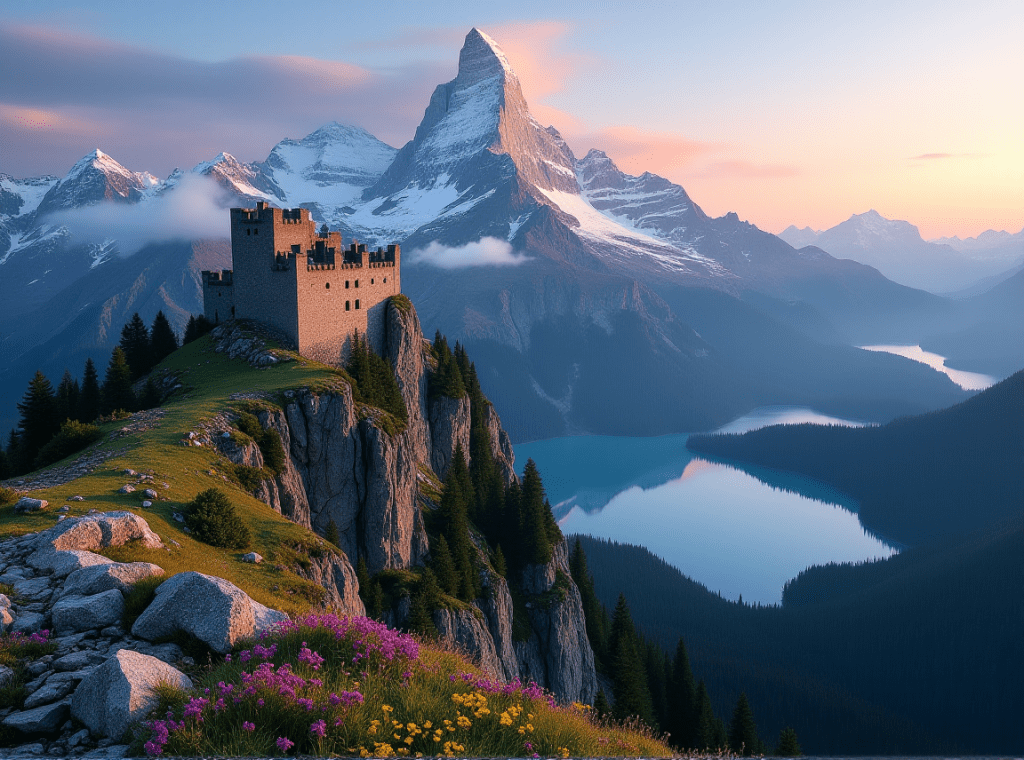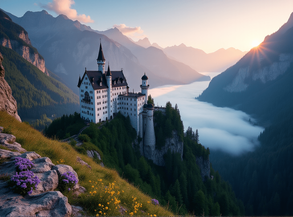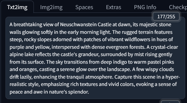It looks like the model added the Matterhorn to the first scene. Apparently the AI model [Stable Diffusion?] knows famous castles by name, so let’s add a famous German castle to the scene.