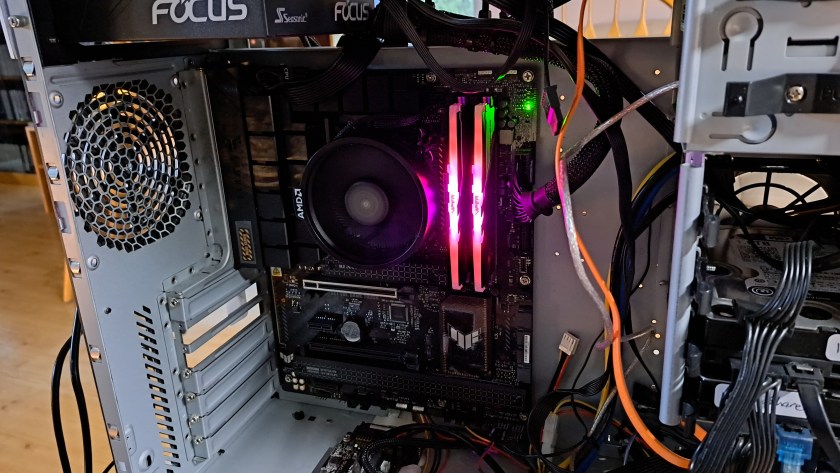 Whew. Since an air cooler was supplied with the CPU, I decided to build the system in stages. Oh. BTW. I’m going to use the 500GB NVME SSD from the previous system. So I started with the CPU, RAM, SSD and put the Motherboard in the case. I put the air cooler on the CPU and started it up. Even this cheap motherboard had three M.2 NVME slots, all with heat sinks.