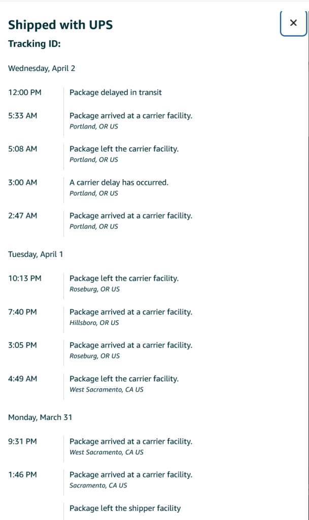 Roseburg, OR to my town is about 85 miles. Portland, OR to my town is about 222 miles. Roseburg to Portland is about 178 miles. So they shipped the package past Roseburg to Portland – 178 miles – plus back to my town, another 222 miles, or about 400 miles further than it might have taken if they dropped it off in Roseburg and then on to my town.