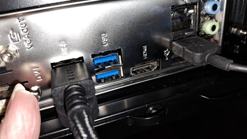 Using an HDMI cable in the slot in the middle of the picture does not work since a modern HDMI cable requires more clearance around the connector. The cable must be modified. This is a design failure of the motherboard interface panel.