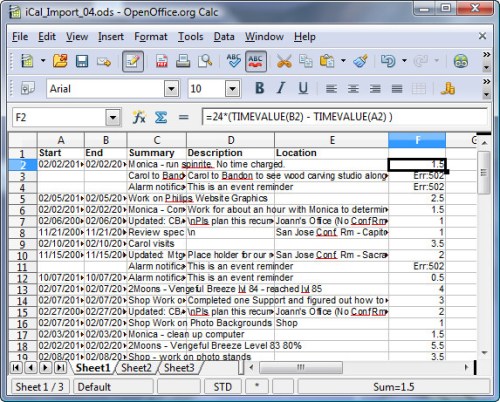 I have started using Google calendar and now I want to analyze the events that I’m saving. Google provides a calendar, but no tools to analyze the events on a calendar. Also they only provide iCal format export of the calendar and no way to move the calendar to Google Docs. An iCal importer for Open Office Calc would have the widest appeal and widest platform support. I have written a simple importer for Open Office 3.1.1. I have not tested it on other versions of OO. You can download it here: iCal_Import_04 The download link it as the top of the page. Wave your cursor at the top of the page to see the V symbol for the download link. Enjoy. BTW, WordPress.com does not allow posting of any zip files so I had to move the file to google drive.