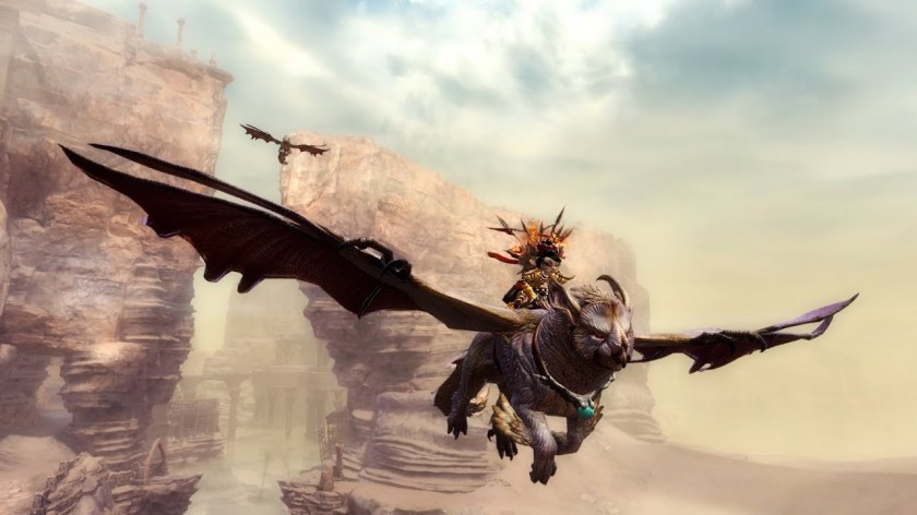 The second “Flying Mount” introduced into GW2, Living World Season 4 is the Skyscale. This has enhanced flight mechanics, but still can’t really fly.