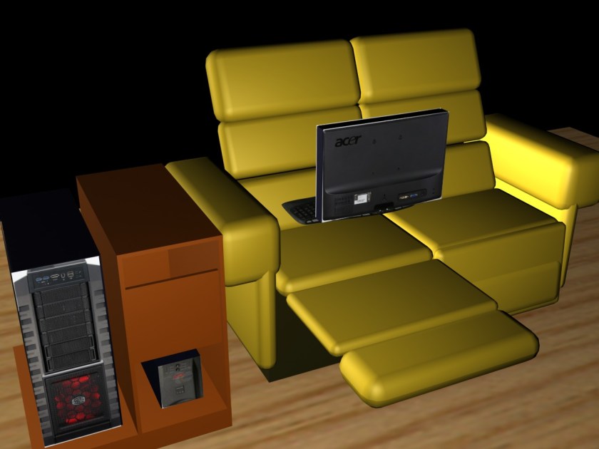 When used for gaming, laptops tend to over heat, and eventually they destroy their video cards. My Alienware m15x laptop, while it seems to have good cooling, has had 4 new video cards in the last 3 years. I have wanted to use a desktop for gaming, but prefer to do most of my playing from the comfort of my recliner. Here is the start of an idea to accomplish that. Missing from the renderings are the arm that holds the monitor from the case to the right of the recliner to the monitor in front of me. As you can see the computer case is very large. I’ve provided for a UPS in the cabinet since in my area all my computers require a UPS due to frequent power glitches that would cause an unprotected computer to reboot. Click on pictures for larger views. Continue reading “Battle Chair Design – Revision 1”