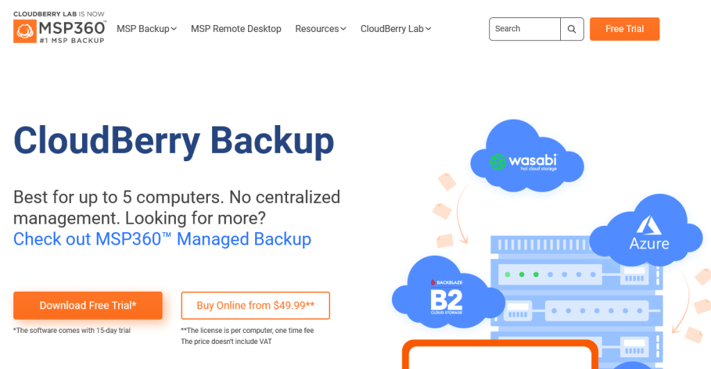 Wasabi [Hot Cloud Storage] provides a naked cloud storage service with an AWS interface. So you need a backup application and after some research, I found Cloudberry. It seemed the best at the time. They have since been purchased by another company. Cloudberry is a simple but functional backup application that can use Wasabi, among others, for cloud storage.